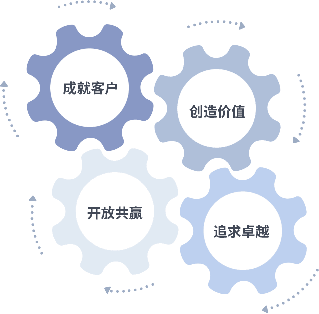 成就客户是一切决策的出发点,,,,创造价值是衡量所有工作的标准,,追求卓越是我们做事做人的态度,,,,开放共赢是我们的格局也是最终的结果。。。价值观的齿轮环环相扣,,推动着组织里的每个人不断向前。。。